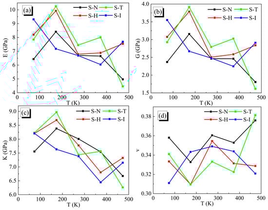 The mechanical properties of four IPN binder systems were estimated at 73.15 K, 173.15 K, 273.15 K, 373.15 K and 473.15 K, respectively. The final results are shown in Figure 7, which were concluded from Equations (5)–(8). For polyether polymers, the H-bonded interactions could form physical entanglements of molecular chains, which enhanced the modulus and strength of the IPN binders. As expected, all HTPE/PEG interpenetrating polymer structure binder models demonstrated the best mechanical properties around the glass transition temperature and close mechanical parameters as a result of the prepolymer skeleton’s ability to hold a high percentage of solid loading. The mechanical properties of S-N, S-H and S-T crosslinking binders showed a similar trend with the temperature change, which reached their highest elastic modulus near the Tg and then tended to decrease. For the S-I binder model, it was obvious that the excellent elastic modulus appeared at the low temperature, which resulted from no movements among molecule chains beyond the Tg. While the S-H and S-T binder systems presented the largest values of mechanical properties, the S-I binder system showed the lowest.
