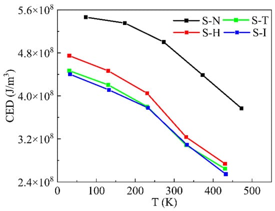 The CED of IPN binder models was calculated at temperatures of 73.15 K, 173.15 K, 273.15 K, 373.15 K and 473.15 K, which is shown in Figure 8. As we can see, the CED of all IPN binder models decreased linearly with the increasing temperature and stayed at a closed value at the same temperature. It was said that the inter-molecular force of HTPE/PEG IPN binder models would decrease with the rising temperature. Furthermore, the big molecule pre-polymers, HTPE and PEG, played a major role, and the small curing agents had an insignificant effect. The S-N IPN binder models always kept their scores higher than others. However, S-T, S-H and S-I IPN binder models performed a close value. It might be due to the special chemical structures of the curing agents, especially the three functional groups of N-100 and the ring structures of TDI and IPDI.