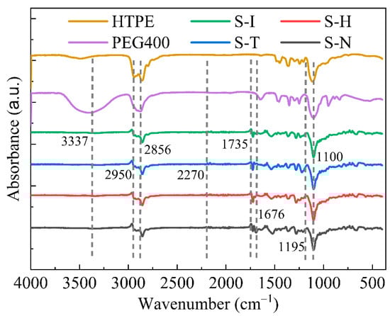 Attenuated total reflected Fourier transformed infrared spectroscopy (ATR/FTIR) was used to characterize the formation of new bonds resulting from crosslinking structures, and the chromatogram analysis is shown in Figure 10. Possible infrared spectroscopy absorption of the polyurethane structures, attained from the curing reaction between the pre-polymers and the curing agents, could identify whether the interpenetrating network polymers were or not. There were obvious variations from the precursors to the primary polyurethanes, when the different curing binder systems were processed for enough time. Most absorption peaks in the ATR/FTIR spectra of crosslinking IPN binders were similar. A wide absorption band of amide -N-H groups stretching vibrations at 3337 cm−1 could be detected in all IPN specimens. The -C-H groups of IPN binders, pre-polymers and curing agents presented the stretching vibration peaks at 2950 cm−1 and 2856 cm−1. The absorption peak at 2270 cm−1, which was attributed to the asymmetric stretching vibration peak of -NCO, performed a large absorption intensity. Therefore, it indicated the most effective characteristic peak for the identification of -NCO groups, which proved that the carbamate structures had been created between the pre-polymers and curing agents. The symbol peaks of polyurethane could be observed at 1676 cm−1 and 1735 cm−1. The stretching vibration peaks of C-O bonds in the ester group were at 1230–1195 cm−1 and the stretching vibration peaks of C-O bonds in the ether group were around 1100 cm−1. However, a few differences in the various HTPE binders were also exhibited, such as the intensity of the main peaks, the position of peaks and even the number of peaks. These behaviors mainly resulted by the various kinds of curing agents, the extra curing agents and the final polyurethane structures. As already demonstrated by the ATR/FTIR spectra intensity, the new polyurethane groups could be significantly noticed and the structures of HTPE binders were successfully crosslinked according to the reaction schemes shown in Section 3.2.