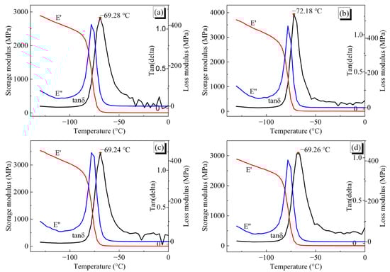 In the dynamic mechanical analyzer (DMA) experiments, E’ was the storage modulus and indicated the elastic properties of materials, which mainly spring back to their pristine form after releasing the stress. E’’ was the loss modulus and represented the viscous properties of the materials, which disappeared as heat. Tan δ referred to the ratio of damping of E’’ to E’, the peak of which could reflect the glass transition temperature (Tg) of the materials. As a result, the peaks of the tan δ curves were associated with the chain releasing of molecules under the development of the temperature. The results of E’, E’’ and tan δ as the function of temperature are shown in Figure 11.