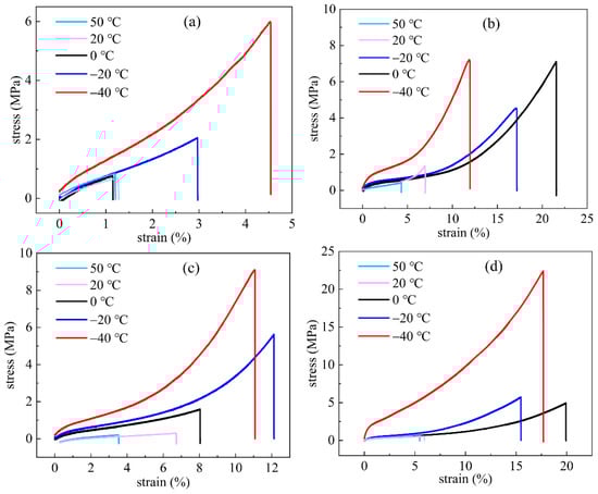 Curves of tensile stress versus strain could explain the relationship between tensile stress and tensile strain in IPN binder specimens’ tensile. Static tensile mechanical properties were necessary and important when studying the mechanical properties of polymer composites, especially for solid composite propellants. The stress-strain curves of S-N, S-H, S-T and S-I interpenetrating polymer network binder specimens tested at −40 °C, −20 °C, 0 °C, +20 °C and +50 °C were shown in Figure 12a–d, respectively. It was obvious that temperatures had a vital influence on the mechanical properties of IPN binders; the tensile strain at break increased with the decreasing temperature. Especially, the excellent tensile ultra-stress and strain at break suggested that the IPN binders combined the soft features of PEG and the high strength of HTPE polymers at low temperatures. Nevertheless, terrible mechanical properties were investigated at high temperatures. The mechanical properties of HTPE/PEG interpenetrating polymer structure binders were improved at high temperatures, compared with HTPE binders [] and PEG binders. Maybe interrupted the force among inter-molecular chains of IPN binders so that the ultra-stress and strain at break were weakened a lot.