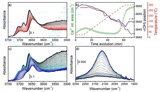 Even though CeO2 and CeZrOx infrared spectra have been known for decades, we here aim to show how to exploit spectral fingerprints related to the Ce oxidation state. C100 spectra collected after thermal activation (described in SI) presented three bands in the ν(OH) region (Figure S5′) at 3704, 3684, and 3657 cm−1 ascribed to monodentate (m-OH), bidentate (b-OH), and tridentate (t-OH) hydroxyl groups (Figure S6), respectively. After the thermal activation, O2-TPO was conducted (Figure 2a) to track the reference variation in ν(OH) positions with temperature. During heating under O2, the absorbance of m- and b-OH bands decreased until a single broad band centered at 3696 cm−1 was formed. At the same time, the broad band centered at ~3500 cm−1, related to physisorbed water, decreased in intensity. In constrast, the t-OH lost intensity and its position shifted linearly to lower wavenumbers, (Figure 2b, red line) until it was stabilized when T = 300 °C. The band position bathochromic linear shift is associated with crystal lattice expansion. Instead, the loss of band integrated area could be related to either a decrease in surface OH groups (i.e., sample dehydration) or to a temperature dependence of the OH molar absorption coefficient (ε) [59,60]. Indeed, following the Beer–Lambert Law (Equation (2)), a variation in ε would directly affect the integrated band area. However, this can be excluded since surface dehydration was observed from the corresponding decrease in the broad band at 3500 cm−1. After having determined the spectral behavior under heating conditions, H2-TPR was conducted on the activated catalyst. First of all, by observing the physisorbed water band (~3500 cm−1), we noticed that the band intensity was relatively higher than the first spectra of the O2-TPO experiment. During H2-TPR, the band intensity initially decreased, indicating water desorption, while it increased again at higher temperatures. Water formation under H2/300 °C is the first evidence of cerium reduction with parallel formation of oxygen vacancies (VO), as described in Equation (1).