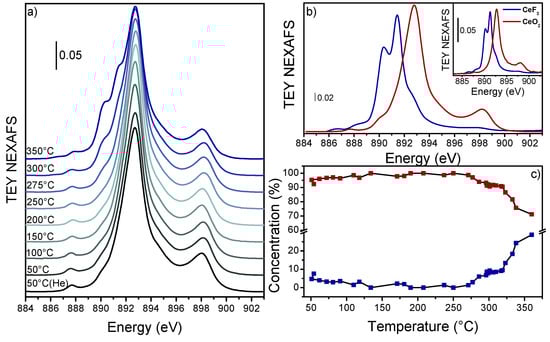 Interestingly, since the FT-IR absorbance of the Ce3+ band and Ce M5-edge NEXAFS results followed the same trend, we attempted to extract the Ce3+ 2F5/2→2F7/2 transition molar attenuation coefficient. By exploiting the integrated Beer–Lambert law [61] (Equation (2) where A = absorbance, ε = molar attenuation coefficient, c = Ce3+ concentration, w = Ce content, and S = pellet area), we reported for the same temperature the evaluated Ce3+ concentration (through Ce M5-edge fit) with respect to the Ce3+ FT-IR band integrated area (Figure S9).