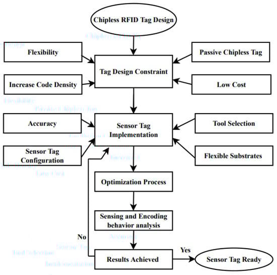 where PTX is transmitting power, GTX is transmitting antenna gain, GRX is receiving antenna gain, λ is the wavelength, PRX is the sensitivity of the receiver and σmin is the most minimum RCS level that can be detected by the reader. The proposed approach that is presented in this paper to develop a chipless RFID sensor tag, which is explained in the flow chart, as shown in Figure 2.