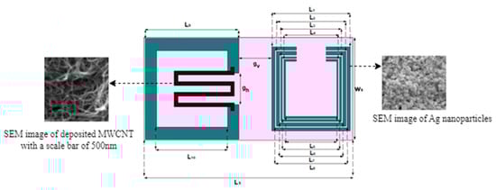 To avoid performance degradation, the width of sensing resonator is 2 mm. The gap between the arms of the sensor part provides a space to insert a multi-wall carbon nanotube (MWCNT)-based sensitive strip, i.e., meandered structure. This increases the area of the sensing resonator and makes it more prone to environmental changes. The SEM image of MWCNT at 2 µm resolution is shown in Figure 3. The initial sheet resistance of MWCNT is 1000 Ω/sq at 25 °C.