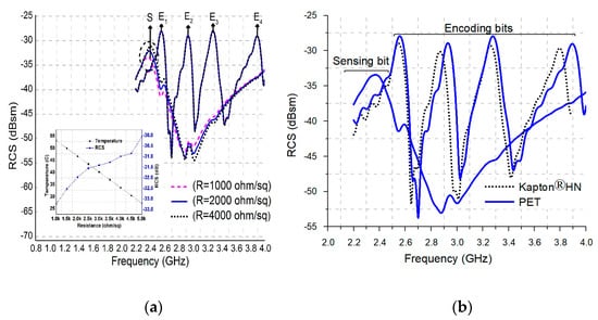Figure 4a shows the optimized results for different resistance values, i.e., 1000 Ω/sq, 2000 Ω/sq and 4000 Ω/sq. The sensing bit peak response shows a rise in amplitude with an increase in resistance of MWCNT. The variation in RCS response does not affect the resonant frequencies, for both sensing and encoding data bits. The results validate that with change in the sensed parameters, only the amplitude of the sensing bit shows variation, while the peak amplitude of neighboring encoding bits remain unchanged. The temperature varies linearly with respect to the sheet resistance.