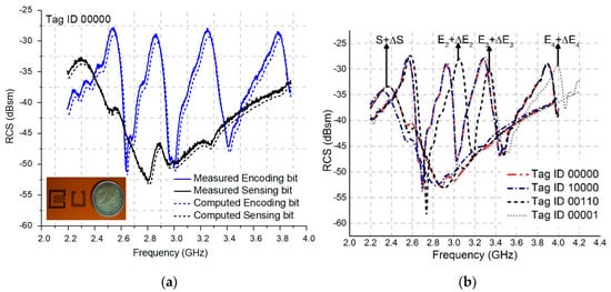 (a) Measured and computed RCS response, (b) measured tag IDs.