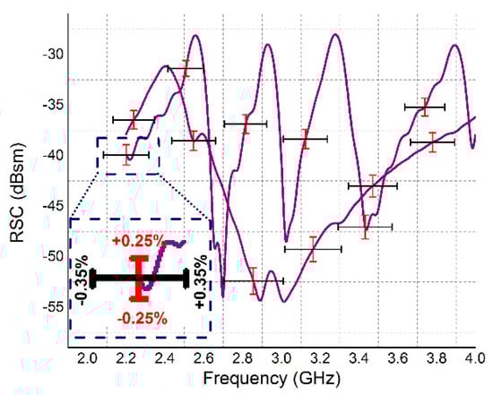 To analyze the reliability of the tag, five protypes of the sensor tag were manufactured and tested. The reliability performance of the sensor tag is shown in Figure 7. It has been analyzed that the tag has tolerance of 0.25% and 0.35% in the RCS and frequency band, respectively, which are of interest. The parametric conclusion drawn is presented in Table 2.