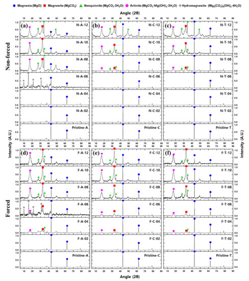 XRD results of the samples for the non-forced (N) wet carbonations of (a) A-MgO, (b) C-MgO and (c) T-MgO as well as forced (F) wet carbonations of (d) A-MgO, (e) C-MgO and (f) T-MgO.