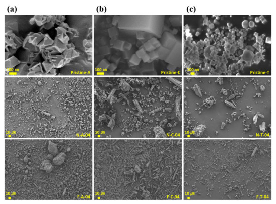 Figure 2 shows the morphological changes from pristine particles to the carbonate products after 4 h of the N- and F-carbonation processes. Pristine A-, C- and T-MgO nano-adsorbents originally had octahedral, cubic and spherical shapes, respectively. After the 4 h wet carbonation, the carbonate products showed significant differences between the N- and F-carbonation processes, which implies that the processes were accelerated by the F-carbonation. F-carbonation samples showed more pillar-shaped nesquehonite [30,32,33], while N-carbonation ones showed more agglomerates of primary particles. This means that F-carbonation accelerated carbonate formation, which is also shown in Figure 1. The F-carbonation processes also produced some agglomerate particles (several tenth~hundredth μm) for the MgO nano-adsorbents, which were made by the collision of primary particles due to the stirring. For N-carbonation, shape changes in the carbonate products caused by incomplete carbonation were observed until the 12 h samples. However, the F-carbonation samples showed almost completed carbonate particles after 8 h samples for all three of the MgO nano-adsorbents (Figures S1–S3). These results also support the findings in the XRD results in Figure 2 and the crystallite size changes in Table 2.