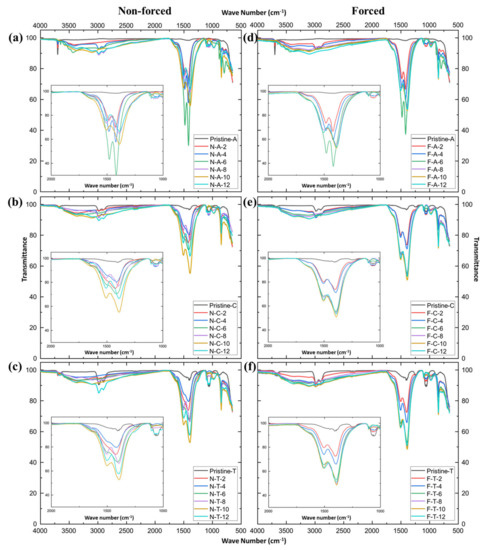 FT-IR spectra results of the pristine MgO nanoparticles and the products after non-forced wet carbonations of (a) A-MgO, (b) C-MgO and (c) T-MgO as well as forced wet carbonations of (d) A-MgO, (e) C-MgO and (f) T-MgO.