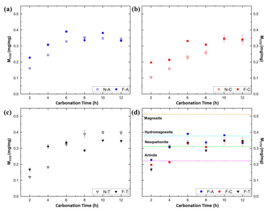Figure 4 shows the amounts of adsorbed CO2 (MCO2) in the unit mass of carbonated samples analyzed by GC-TCD. The differences in the MCO2 between F- and N-carbonation samples are also summarized in Table 3 according to the carbonation time. Overall, the F-carbonation samples showed larger amounts of MCO2 in the sample compared to the N-carbonation ones in the early stage of the carbonation processes. F-carbonation increased the magnitude of MCO2 for all three of the MgO nano-adsorbents until the 6 h samples, compared to N-carbonation samples, as shown in Figure 4a–c. The F-carbonation of the three MgO nano-adsorbents showed almost similar magnitudes of MCO2 from 6 h, as also described in FT-IR, and the averages and standard deviations of MCO2 of F-carbonation between 6, 8, 10 and 12 h were as follows: A-MgO: 0.360 ± 0.026, C-MgO: 0.331 ± 0.015 and T-MgO: 0.329 ± 0.025. However, N-carbonation needed relatively more carbonation time to show these flat saturations and the three MgO nano-adsorbents showed different times for this saturation. As also mentioned in a previous study [8], C-MgO needed the longest carbonation time of 10 h, while A-MgO required a time almost similar with F-carbonation (6 h). The MCO2 for the three F-carbonation samples with the theoretical maximum amounts of MCO2 by different kinds of hydrated magnesium carbonates (artinite = 0.2238, nesquehonite = 0.3181, hydromagnesite = 0.3764 and magnesite anhydrous = 0.522 mg-CO2/mg of each standard carbonate) are described in Figure 4d. The MCO2 amounts of the three MgO nano-adsorbents placed between hydromagnesite and nesquehonite after 6 h of wet carbonation, and the F-carbonation processes were finished as shown by the FT-IR and XRD data. This implies that most of the nano-adsorbent particles were transformed into hydrated magnesium carbonates, rather than anhydrous MgCO3, due to the reaction temperature and moderate pressure of CO2 gases [33].