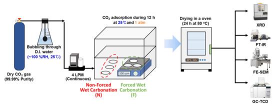 Scheme 1 shows the experimental setup for the wet carbonation of the 3 MgO nanoparticle-based adsorbents. The nano-adsorbents were prepared as slurries by mixing 500 mg MgO nanoparticles with 5 mL D.I. water in a glass petri dish. The 3 MgO nano-adsorbents were simultaneously exposed to CO2 in the wet carbonation chamber. The wet carbonation was conducted at the normal indoor air condition (~25 °C and 1 atm) [8]. One of each nano-adsorbent was placed in the chamber without stirring (non-forced sample, N) and the other was agitated by a magnetic stirrer at 100 rpm (forced sample, F). Pure CO2 gas (99.99% purity) was conditioned at ~100%RH at 25 °C by passing through a bubbler filled with D.I. water at 4 lpm using a mass flow controller (Alicat Co., Ltd, Tucson, AZ, USA). Then, the humidified CO2 was continuously introduced into the wet carbonation chamber. Farajzadeh et al. reported the characteristic time of dissolving of gas phase of CO2 (~99.9%) (CO2 + H2O → H2CO3) into water through the CO2-water interface at ~100%RH, room temperature (25 °C) was <25 s [28], which is much shorter than our experimental time scale (every 2 h sampling, up to 12 h). In addition, H2CO3 in the MgO nano-adsorbent slurries could be fully developed during the wet carbonation because the thicknesses of MgO slurries in the petri dishes were negligible compared to the height of carbonation chamber. The evaporation of waters in the slurries was also prohibited by controlling the relative humidity of gas environment in the chamber as ~100%RH through the wet carbonation processes. The intermediate carbonate samples for each MgO nano-adsorbent were taken every 2 h, up to 12 h. After the sampling, 1 mL D.I. water was added to maintain the volume of slurry. All carbonate samples were immediately dried in the oven at 80 °C for 24 h.