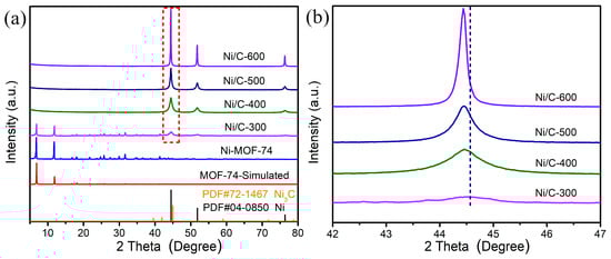 (a) Simulated pattern and XRD patterns of MOF-74-Ni and derived Ni/C materials treated at different temperatures, (b) enlarged diffraction peak attributed to the Ni (111) crystal plane in (a).