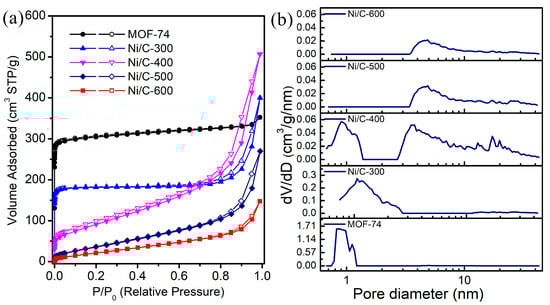 (a) N2 adsorption−desorption isotherms and (b) pore size distribution of MOF-74 and derived Ni/C at different temperatures.