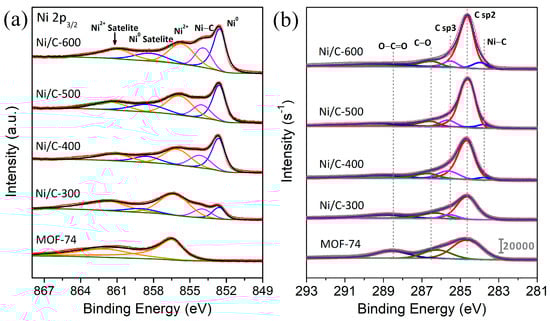 (a) Ni 2p3/2 XPS spectra and (b) C 1s XPS spectra of the MOF-74 and Ni/C derivatives prepared at various temperatures.