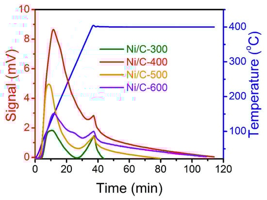 The activation of H2 is a crucial process during the catalytic hydrogenation reaction, and the H2 dissociation process is highly sensitive to the surface Ni. Hence, for further investigating the H2 dissociation difference between four catalysts, the H2-TPD profiles of the four Ni/C catalysts are detected (Figure 5). To avoid the interference of the TCD signal caused by further decomposition of the catalyst, the temperature program is ended at 400 °C. The hydrogen desorption peaks in the range of 50–300 °C are mainly ascribed to the removal of chemisorbed hydrogen on the metal surface, and the area of the desorption peak represents the amount of desorbed hydrogen. Ni/C-400 catalyst exhibits the highest amount of chemisorbed hydrogen, which has an association with surface electron-deficient Ni species []. However, higher treatment temperatures lead to Ni aggregation and the formation of a carbon layer, which may cover and decrease the surface active Ni content, leading to a decline in the ability to adsorb and dissociate H2.