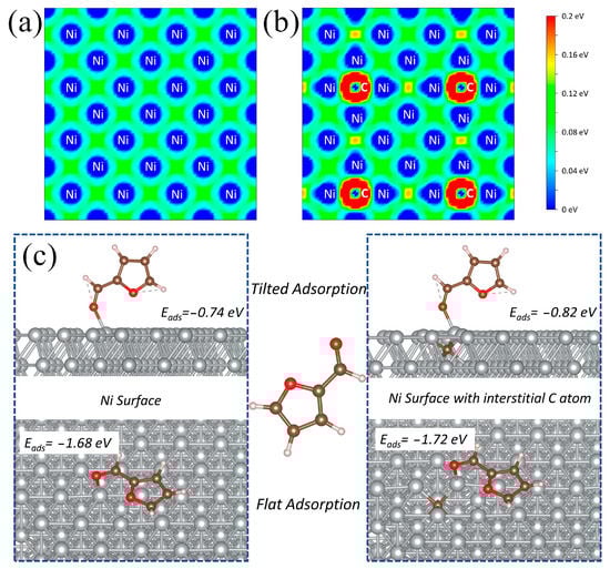 Charge density difference plots of (a) Ni and (b) Ni with interstitial carbon, (c) adsorption energies of different furfural adsorption configurations on the surface of Ni (111) with and without interstitial carbon.
