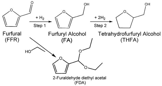 Pathways for hydrogenation of furfural (FFR) to tetrahydrofurfuryl alcohol (THFA) via furfuryl alcohol (FA) and the formation of byproduct 2-furaldehyde diethyl acetal (FDA).