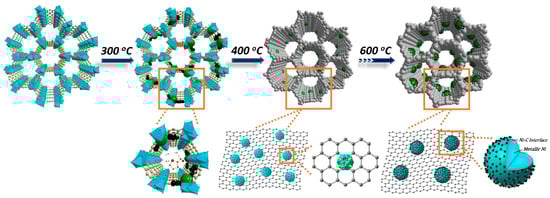 Formation of Ni nanoparticles derived from MOF-74 at different heat treatment temperatures with different surface structures.