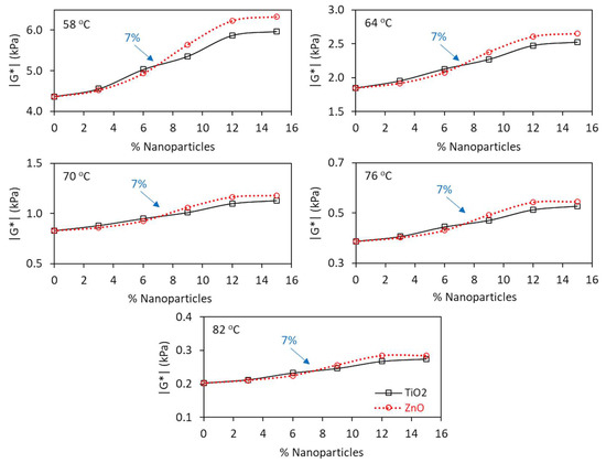 Comparison of the effect of the percentage of TiO2 and ZnO on the dynamic shear modulus (|G*|) of conventional binder short-term aged at high temperatures (58 °C to 82 °C).