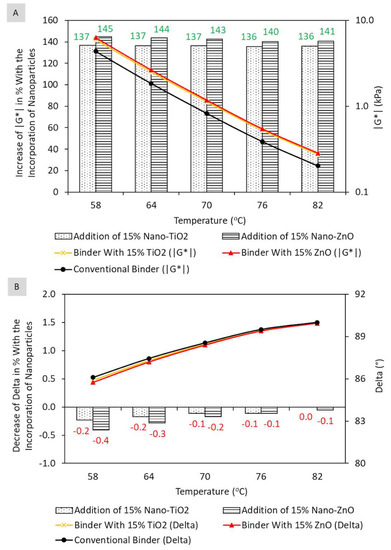 As shown in Figure 6A, the incorporation of 15% of nanoparticles in the asphalt binder, considering all temperatures, causes an average increase in the dynamic shear modulus of 136.3 ± 0.4% when using nano-TiO2 and 142.4 ± 1.9% when using nano-ZnO. Regarding the phase angle, it is possible to verify (Figure 6B) average delta reduction of 0.13 ± 0.09% with nano-TiO2 and 0.21 ± 0.14% with nano-ZnO, considering all temperatures. Thus, as the change in the phase angle with nanomodification is negligible, the parameter |G*|/sin δ increases practically in the same proportion as the dynamic shear modulus, that is, by 136.3 ± 0.5% and 142.6 ± 2.0%, when incorporating 15% nano-TiO2 and 15% nano-ZnO, respectively.