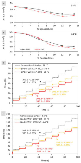 Behavior of asphalt matrices (after RTFOT) in terms of creep and recovery during the MSCR test at stress of 3.2 kPa: non-recoverable creep compliance as a function of the percentage of nanoparticle at temperature of 58 °C (A) and at temperature of 64 °C (B) and comparison of creep and recovery curves of the conventional binder in relation to composites with 15% TiO2 and 15% ZnO at temperature of 58 °C (C) and at temperature of 64 °C (D).