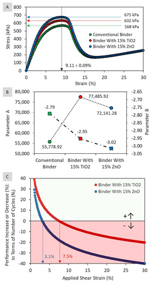 According to the stress–strain curve shown in Figure 8A, the addition of nanoparticles at 15% content increases the matrix stiffness at intermediate temperatures, as the slope of the curve in the elastic region is more pronounced for composites with ZnO and TiO2, respectively. This statement is corroborated by the maximum stress peak, with higher values for ZnO (675 kPa, 18.7% higher) and TiO2 composites (632 kPa, 11.1% higher) compared to the conventional binder (568 kPa) in the same deformation amplitude (9.11 ± 0.09%). Comparing nanoparticles, the sample with 15% zinc oxide has a maximum stress 6.8% higher than sample with 15% titanium dioxide.