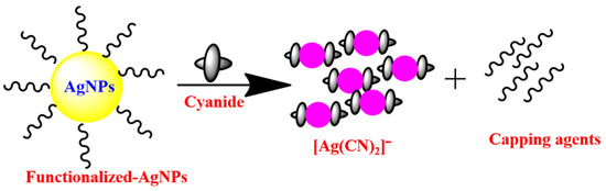 S. Hajizadeh et al. [60] reported the high sensitivity and specificity for sensing cyanide ions in water using sodium dodecyl sulfate (SDS) -functionalized AgNPs with naked-eye visual observation. The presence of the cyanide ions caused the plasmonic optical response of SDS-AgNPs to be reduced, in turn decreasing the color contrast, resulting in a colorless state. This colorimetric sensor showed the linear relationship between plasmonic absorbance and the cyanide ion concentration in the range of 16.7–133.3 μM at the wavelength 394 nm. The SDS-AgNP-based approach obtained the cyanide detection limit of 1.8 μM and was exploited for its application in cyanide detection in dam water samples.