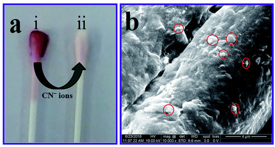 (a) β-CD AuNPs coated cotton swab (i), reaction with a concentration of 99 μmol dm−3 of CN− ions changes the color from wine red to colorless (ii), and (b) FE-SEM image clearly showing that the AuNPs were embedded in the cotton swab (red circles). Reproduced from Ref. [73] with permission from the Royal Society of Chemistry.