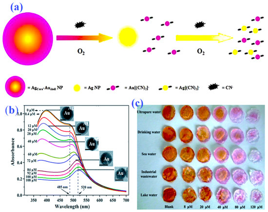 - Zeng, J.; Cao, Y.Y.; Chen, J.J.; Wang, X.D.; Yu, J.F.; Yu, B.B.; Yan, Z.F.; Chen, X. Au@Ag core/shell nanoparticles as colorimetric probes for cyanide sensing. Nanoscale 2014, 6, 9939–9943. [Google Scholar] [CrossRef]