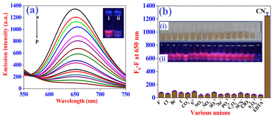 Sensitivity (a) outcomes for the AuNCs with increasing concentrations of cyanide anions. The a-to-p curves represent the cases of adding cyanide ion concentration from 0 to 7.5 μM with 0.5 μM step. The inset shows AuNCs without (i) and with (ii) the addition of cyanide anions. Selectivity (b) results for AuNCs in the presence of various potential inorganic anions; the inset shows corresponding colorimetric (i) and fluorescence color changes under daylight and UV light, respectively. Figure reproduced from Ref. [116] with permission from the American Chemical Society.