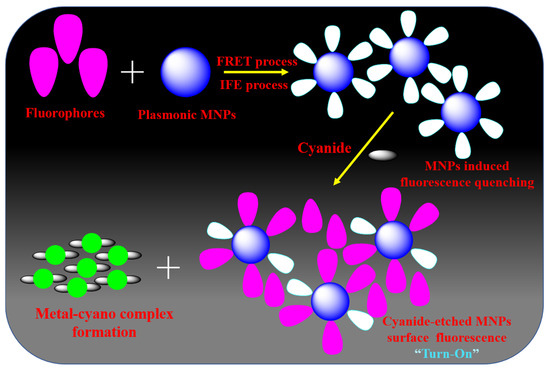 By employing target-triggered emission quenching of thiosalicylic acid stabilized-CuNCs nanoassay, Jinshun Cang and colleagues [125] developed the double-sensing assay for the measurement of cyanide and nitrite anions. Due to the pH sensitivity of this optical chemosensor, nitrite detection was carried out in an acidic medium, whereas cyanide detection was done in an alkaline medium as the cyanide etching occurred more effectively in an alkaline medium than an acidic one. This technique was successfully applied to analyze samples of lake water. Fei Sun’s research group [126] reported on CuNCs with and without salicylaldehyde molecules for multi-cations and toxic cyanide anion sensing in real water samples and biological fluids. With rising quantities of cyanide anions, the fluorescence properties of CuNCs are routinely improved in this sensing technique. In this case, the aldehyde group was responsible for the nucleophilic attack of cyanide. As a result, CuNCs’ emissive properties were improved, and this approach showed an LOD of 0.51 M. This nanosensor was further developed for biological applications, such as for detecting cyanide ions in cancer cells. CuNC-based cyanide sensing techniques also follow the mechanism of metal-cyano complex production by cyanide etching of NC surfaces [124,125,126].