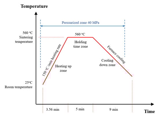 Different techniques are used to ensure homogenous dispersion of the additive materials inside the matrix to prepare the composite samples. In the current study, the high energy ball-milling approach was utilized to blend magnesium powder with titanium dioxide nanofibers homogenously. Firstly, the magnesium powder was set for one hour into a stainless-steel jar and planetary ball mill (Desktop 220 V High Energy Vibratory Ball Mill with 80 mL Jar from Across International Company, Livingston, MT, USA) to de-agglomerate any coalesced powder. Secondly, the titanium dioxide nanofibers were added to the magnesium with different weight fractions 1, 3, 5, and 10 wt.% and mixed for half an hour to ensure homogenous dispersion of TiO2 nanofibers inside the Mg matrix. Thirdly, the nanocomposite mixture was inserted into the High-Frequency Induction Heat Sintering (HFIHS) process (HF Active Sinter System, ELTek CO., Gyeonggi-do, Republic of Korea) for consolidation. The Mg/TiO2 powder was loaded into a graphite die with an inner diameter of 10 mm and a height of 15 mm. The sintering temperature was adjustable and controllable using an optical pyrometer from Thermalert TX, Raytek GmbH, Berlin, Germany. During the sintering process, the mixture was exposed to a pressure of 40 MPA at a temperature of 560 °C heat rate of 150 °C/min for 5 min inside a vacuum chamber of 2 × 10−3 Torr to prohibit composite samples oxidation. Then, the Mg/TiO2 samples were left to cool until room temperature was reached. Figure 2 illustrates the heat map of the consolidation process.