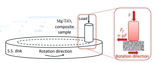 The tribological properties of the magnesium composites were evaluated using a pin on disk apparatus (universal tribometer Mod. UMT-2MT testing block sin T45815 Bruker-Nano Surfaces) in a dry rubbing condition based on ASTM G99-95 [41]. The Mg/TiO2 represented the pin of the apparatus, and the disk was made of stainless steel with a roughness of 13 μm. The Mg/TiO2 samples surface was polished before the experiment using fine-grade paper. Then, the sample surface was washed with acetone solution and dried using a high-pressure air jet to prevent any remaining contaminations before the experiment. The apparatus consists of two load cells, one for the normal force F and the other for the friction force Ff. The friction coefficient µ was estimated by dividing the friction force by the normal force, as shown in the schematic diagram in Figure 3. To evaluate the specific wear rate, the Mg/TiO2 samples were weighed before and after each experiment. The wear test was performed five times for each Mg/TiO2 sample, and the average friction coefficient and specific wear rate were calculated. To investigate the wear mechanism, the worn surfaces were scanned using a field emission scanning electron microscope.