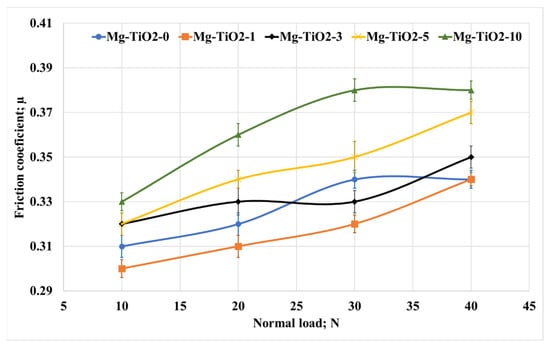 To evaluate the effect of titanium dioxide nanofibers loading fraction on the tribological properties of magnesium composites, the Mg/TiO2 nanocomposite samples were tested against a stainless-steel counterpart under different applied loads of 10–40 N, different sliding distances at a fixed sliding speed of 0.4 m/s and sliding distance of 900 m. Figure 6 illustrates the change in the friction coefficient for Mg/TiO2 nanocomposites under different applied loads. It is obvious that increasing TiO2 nanofibers led to an increase in the friction coefficient for different applied loads. The results reveal that the highest recorded friction coefficient was 0.38 for Mg-TiO2-10 at 40 N normal load, which is 18% higher than Mg-TiO2-0 (0.33). However, the friction coefficient was slightly decreased for Mg-TiO2-1 compared to Mg-TiO2-0, and it recorded the lowest friction coefficients among all Mg/TiO2 nanocomposites. Investigating the effect of the normal load, the results showed a gradual increase in the friction coefficient accompanied by the increase in the normal load. The increase in the normal load can result in an increase in the contact temperature in which the adhesion between the rubbed surfaces could increase and increase the friction coefficient [50,51].