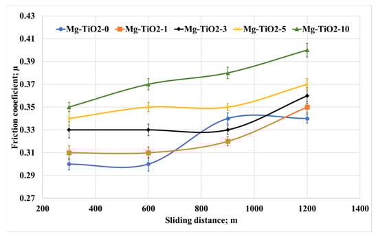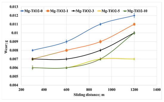As most components used in the frictional process work for a long time, the change in the tribological properties of Mg/TiO2 nanocomposites was evaluated with the change of the sliding distances. The friction tests were conducted under a normal load of 30 N for different sliding distances of 300, 600, 900, and 1200 m. The average friction coefficient and weight loss were measured and recorded, as shown in Figure 8 and Figure 9, respectively. Figure 8 shows an increase in the friction coefficient accompanied by an increase in the sliding distance. However, the tribological performance for all the composites remains the same, where Mg-TiO2-10 records the highest friction coefficient among other nanocomposites. As mentioned before, heat is generated due to the rubbing of the contact surface. Increasing the sliding distance increases the generated heat in which the adhesion force between the contact surfaces increases, leading to an increase in the friction coefficient. On the other hand, Figure 9 illustrates the weight loss due to the change in the sliding distance. It is obvious that Mg-TiO2-5 and Mg-TiO2-10 still have the lowest weight loss among other composites. However, a slight increase in weight loss occurred due to the increase in the sliding distances. For Mg-TiO2-5, the weight loss due to the increase in the sliding distance from 300 m to 1200 m is not exceeding 15%. The tribological results prove that incorporating TiO2 nanofibers into the Mg matrix could enhance wear resistance. These results may be attributed to the enhancement achieved in the mechanical properties of the composite.