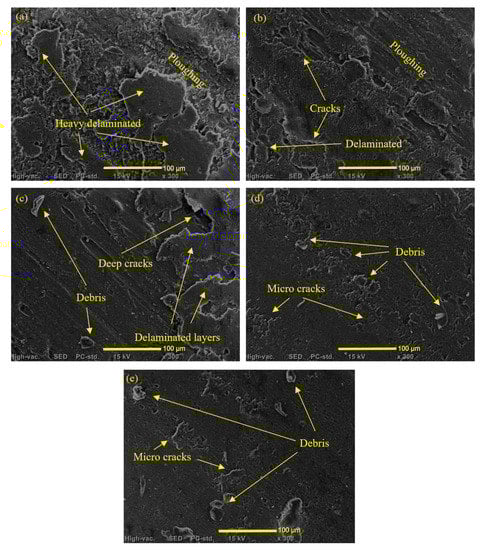 To investigate the wear mechanisms that occurred during the frictional test of the Mg/TiO2 composites, the worn surfaces were analyzed using a scanning electron microscope, as shown in Figure 10. The wear mechanism analysis was conducted for testing parameters of 900 m sliding distance, 30 N normal load, and a fixed speed of 0.4 m/s. Before scanning the worn surfaces, a coating layer of platinum is used to enhance the conductivity of the sample. Figure 10a illustrates ploughing along the Mg-TiO2-0 sample in the direction of the frictional process. Cracks and delamination layers accompany the ploughed surfaces. By evaluating the worn surface of the pure magnesium, it is obvious that there is a combination between the abrasive wear mechanism and delamination wear mechanism—incorporation of TiO2 nanofibers up to 3 wt.%, Figure 10b,c, the ploughing and delamination decreased, and the cracks became more obvious. The decrease in the Mg-TiO2-1 and Mg-TiO2-3 surface deterioration could be attributed to the enhancement in the mechanical properties of the composite due to the addition of the TiO2 nanofibers. Such surface cracks show that the wear mechanism transfers from a delamination mechanism to a fatigue-delamination wear mechanism. Increasing the TiO2 nanofibers weight fraction to 5 wt.% enhanced the surface hardness and the composite’s bonding strength, improving the surface wear resistance, and reflecting smooth surface, as shown in Figure 10d with the existence of some microcracks and debris. In Figure 10d, The worn surface of Mg-TiO2-10 shows some micro-cracks and debris besides some voids that interpret the agglomeration that occurred due to the increase of TiO2 nanofibers weight fraction to 10%. Such agglomerated nanofibers were simply dragged away during the frictional test, and therefore, much wear debris appeared on the worn surface.