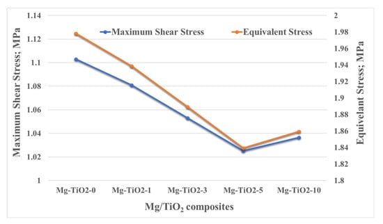 Figure 12 shows the equivalent and maximum shear stress change due to incorporating TiO2 nanofibers into the Mg matrix. For both types of stresses, the maximum stress appears on the edge of the Mg/TiO2 composites, which is the starting point of the frictional process. The incorporation of TiO2 nanofibers into the Mg matrix obviously led to a decrease in both the equivalent and maximum shear stresses. Such a decrease in the contact stresses during the frictional process indicates an enhancement in the load-carrying capacity. The enhancement in the load-carrying capacity is in line with the experimental results where mechanical and wear resistance enhancement were achieved.
