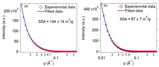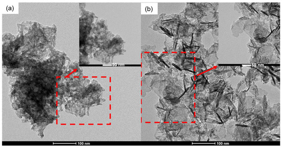 The TEM micrographs of the MnB nanoflakes are presented in Figure 3, and their high magnification micrographs are presented in the inserts of the same figure. The flaky morphology of the MnB nanoparticles is evident in both samples. When comparing the two samples with each other, both samples exhibit nanoflakes that are polydisperse in size, with the MnB−I sample having significantly smaller size flakes when compared to the MnB−II sample. This is also reflected in their calculated specific surface areas from their associated SAXS patterns (Figure 4). In addition, the thickness of the nanoflakes for sample MnB−I is very difficult to be determined from their TEM micrographs (Figure 3a). The same does not apply for the MnB−II sample where the nanoflakes are larger in size and have well-defined edges (Figure 3b). The average thickness of the MnB−II nanoflakes was calculated at ~5 nm. Lattice fringes are not present in any of the two samples, since the MnB nanoflakes are not crystalline enough. The calculated specific surface area for the MnB−I sample was 144 ± 14 m2/g (Figure 4a), whereas for the MnB−II sample it was 67 ± 7 m2/g (Figure 4b), almost half of the value of the MnB−I sample.
