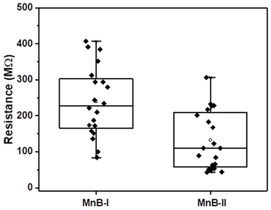 The topography of the MnB nanoflakes is shown in Figure 7. As shown in Table 2 and Figure 8, the resistance of the MnB−I sample was 1.80 times higher than that of the MnB−II sample, respectively, which means MnB−II possesses the highest electrical conductivity. The relative values presented here can be considered as reliable, whereas the absolute values depend on the contact area, which is not precisely known.