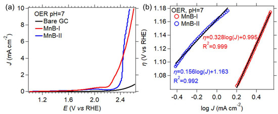 Figure 10 displays LSV for the OER up to a current density of 10 mA∙cm−2 for the two MnB nanoflake samples and the bare GC electrode.