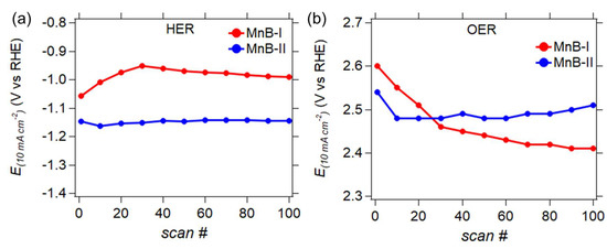 One hundred scans at a scan rate of 1 mVs−1 were performed to evaluate the stability of the MnB nanoflakes for HER and OER at pH 7. Figure 11 demonstrates how the potential at a current density of 10 mA cm−2 fluctuates over the consecutive scans. Both the MnB−I and MnB−II samples (Figure 11a) exhibited a stable HER activity over 100 scans, demonstrating no degradation. The OER stability test for the MnB−II sample (Figure 11b) showed quite stable behavior throughout. The MnB−I sample exhibited a drop in its OER activity over time as its conductive layer peeled off locally from the electrode’s surface after the first scan. The good HER and OER stability of the MnB−II sample for the HER and the OER could be due to its enhanced conductivity and/or the reversible electron transfer phenomena in the amorphous manganese boride samples. The electronegative Mn active sites present on the MnB−II sample may avert the Mn sites from oxidation, enhancing in this way the overall catalyst stability.