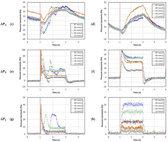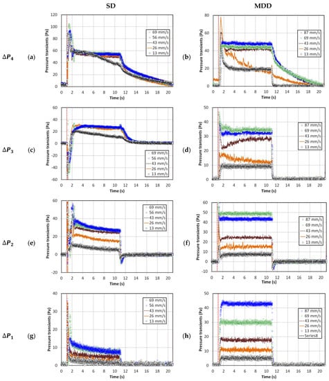 The effect of velocity variation on the SD fluidized bed was not always notable, except in the lower middle region that is represented by  in Figure 2e. Since the bed was not fluidized at 13 mm/s, its dynamics inevitably differed from others. Unlike SD, the effect of velocity on the local dynamics of the MDD fluidized bed was significantly pronounced with substantially faster dynamics. Once the pulsed flow began, the pressure drop almost attained a steady state value within a span of 1 s. The collapse process also finished in one second, with the pressure drop attaining a zero value. However, some exceptions were seen for the upper region () and the upper middle region () of the bed. The faster dynamics of the MDD strategy could be due to the availability of second escape routes for the residual air through the plenum in addition to the top of the bed. Being closer to the lower drainage pathway, the difference between the two strategies in behavior was inevitably more pronounced in the lower region (Figure 2g,h). The evolution of pressure transients and their dependence on velocity in Figure 2h clearly highlight the improved bed hydrodynamics obtained using the MDD strategy. However insignificant, the initial pressure drop spike in the MDD pulsed bed could have resulted from the time lag in the closing of the vent valve and the opening of the flow valve.