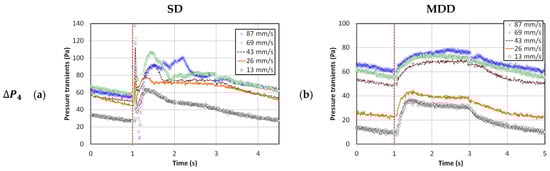 The behavior of the higher frequency pulsed fluidized bed is shown in Figure 3. The inlet flow occurred for 2 s only, followed by 2 s of complete interruption. Therefore, neither the expansion nor the collapse process could reach a steady condition in most cases, irrespective of whether SD or MDD strategy was implemented. The evolution of MDD pressure transients were rather predictable, whereas a great deal of disturbances was evident for the SD transients. These disturbances were strongly affected by the change in velocity. In the case of MDD,  and  showed faster transients than  and  owing to the availability of the lower deaeration route through the plenum. Away from the distributor, the transients were slower, especially at higher velocities, because of the presence of a greater amount of residual gas. On the other hand, the complex, unpredictable pressure drop transients in the SD pulsed fluidized bed developed due to the interaction between the solid particles, whether rising or falling and the upward rising gas flow through the bed. The difference between the local bed dynamics in the two cases of different frequencies was also observed in the initial pressure drop spike, which appeared to be significantly mitigated for the higher frequency pulsed flow owing to a lower line pressure buildup due to the shorter duration of the no-flow phase of the pulsed flow.