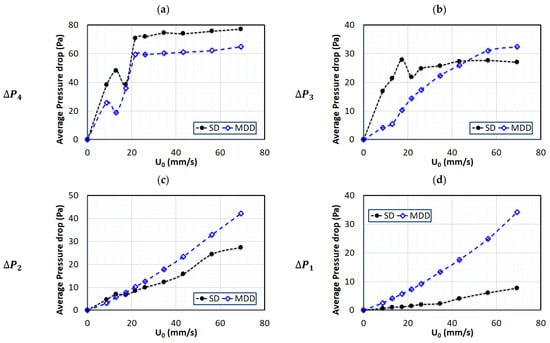 Similar behavior was observed for the case of 0.25 Hz pulsed bed in Figure 6. A clear difference between SD and MDD was detected in the lower region, where a higher pressure drop was obtained with MDD, and the difference between the two strategies was more pronounced at higher velocities. However, the difference was not as prominent as it was in the lower frequency case. The trend was reversed for the upper middle region () and the upper region () due to the material balance consideration, as explained in the preceding paragraph. The MDD bed hydrodynamics appeared to be more sensitive to the frequency change. The upper middle region showed a decrease in the pressure drop at higher velocities due to the bed expansion that caused the migration of solids to the upper region, where this phenomenon was reflected in the increase in the pressure drop.