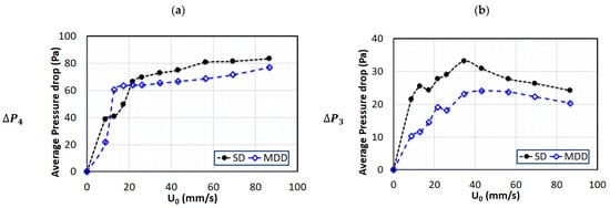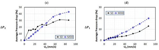 The bed hydrodynamics were further investigated by computing the mean value of the pressure drop from the pressure transients. The latter portion of the flow pulse, immediately before the flow cutoff, was used to evaluate the mean. The case of 0.05 Hz pulsed fluidized bed is considered in Figure 5. Only the defluidization part of the experimental run was compared for SD and MDD, owing to its repeatability. The difference was significantly pronounced in the lower region of the bed (), which was monitored in the bed region from 5–100 mm above the distributor (Figure 5d). At higher flowrates, the difference between the two pressure drop values reached several folds with a steeper rise for the MDD, indicating the presence of smaller agglomerates. A similar difference, albeit less pronounced, was again observed for  (Figure 5c). A smoother pressure drop profile was seen with the MDD in the upper middle region (Figure 5b). The upper region, represented by , fully fluidized at approximately 20 mm/s, with a higher pressure drop for SD. Given that the total weight of solid particles in both cases were the same, the total pressure drops across the bed for the fully fluidized bed in both cases should be comparable. The lower pressure drop values in the lower region obtained with SD were therefore compensated in the upper region of the bed. Owing to the size segregation of nanoagglomerates, the bed showed partial fluidization. The upper region with smaller agglomerates fluidized at 20 mm/s, whereas the lower region with large agglomerates remained un-fluidized even at higher gas velocities.