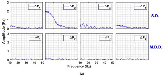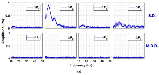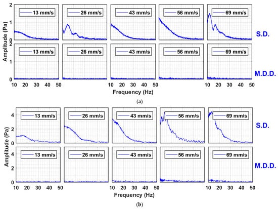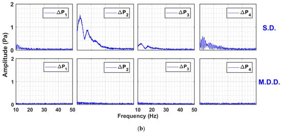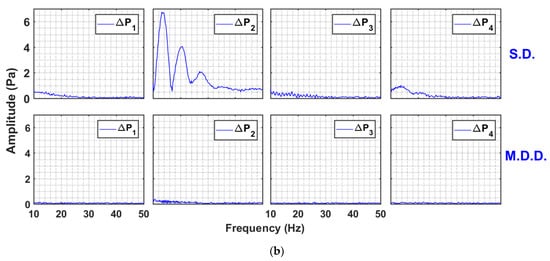 Amplitude spectral analysis of global pressure drop transients of SD and MDD pulsed fluidized bed at (a) 0.05 Hz; (b) 0.25 Hz.