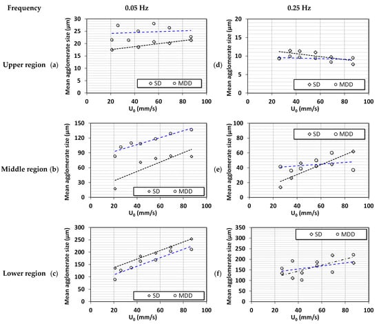 The average diameters from local dynamics were calculated during the collapse of the bed. The mathematical model based on mass balance proposed by Nie and Liu was used []. The diameters of the agglomerates are reported in Figure 10. For 0.05 Hz in Figure 10a–c, the segregation was clearly visible for SD configuration. The range of diameters for upper, middle, and lower regions were 15–22, 30–90, and 140–260 μm, respectively. The agglomerate size in the upper region was almost constant with airflow rate, while agglomerates in the middle and lower regions showed a consistent increase with airflow rate because finer particles moved to the upper region due to segregation. For the case of MDD configuration, the size ranges were 20–30, 90–140, and 100–200 μm in the upper, middle, and lower regions, respectively. The size difference between the agglomerates in the lower and middle regions was not as pronounced as those in the case of the SD configuration. The MDD configuration suppressed the segregation tendencies in the pulsed fluidized beds. At higher frequencies (Figure 10d–f), the size ranges were similar for both flow strategies with strong segregation behavior that was seen for the case of 0.05 Hz SD configuration. This means that the disturbances generated due to high-frequency pulsation developed a similar impact on the hydrodynamics as the initial airflow spike in the lower frequency. Moreover, the slope of the curve in Figure 10d decreased with increasing airflow, signifying the addition of finer particles in the region. Moreover, the slope of curves in Figure 10e,f was lower than that in Figure 10b,c. This finding could be due to the deagglomeration phenomenon, wherein the size of larger particles decreased, and finer particles moved to the upper region.