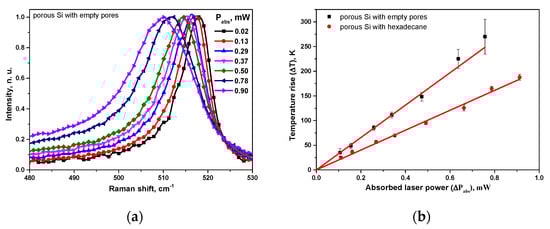 As one can see in Figure 2a, the main Raman peak (corresponding to the cubic Si LO phonon mode) of the typical porous Si layers with empty pores shifts towards lower phonon frequencies when the absorbed laser power increases. The laser heating-induced red-shift of the Raman peak as high as 10 cm−1 over the 0.02–0.9 mW range of the absorbed laser powers is also accompanied by a characteristic spectral broadening of the peaks.